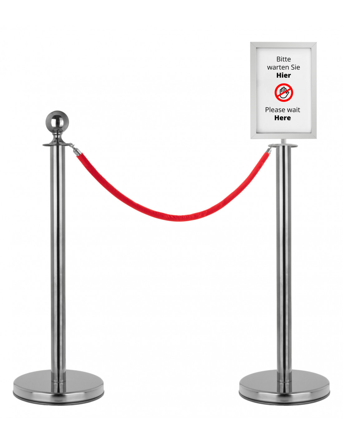 MULTIPURPOSE - professional and level-locking system for concerts, exhibitions, hotels, cinemas, clubs, museums, airports, theaters, award ceremonies, hospitals, department stores and much more, ROBUST CONSTRUCTION - The 5.2 kg stainless steel guide posts have a very low center of gravity and are therefore very stable., VERSATILE - Almost any number of cords can be clicked into the upper ring with the snap hooks. With the screw-on, double-sided sign holder (DIN A4), information can be relayed quickly and easily., BLOCKING POST - Height: 96 cm, diameter of column: 5 cm, diameter of ball: 7 cm, diameter of base: 32 cm, height of rope fastening ring: 84 cm, weight per post: 5.2 kg, ROPE INFO- Red cord with a velvety surface, silver snap hook, diameter rof ope: 3.5 cm, length of rope: 1.5 m,