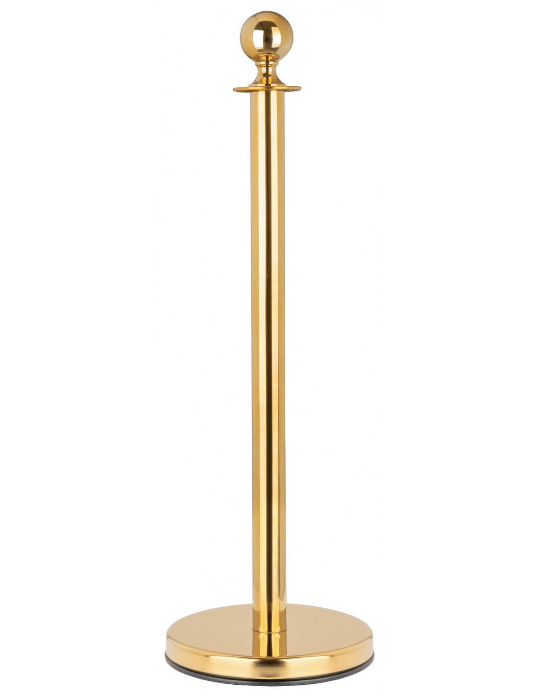 Stand made of stainless steel in gold, can be combined with other guide posts, Suitable for indoor and outdoor applications, upper end has spherical shape, Post height: 96 cm, ball diameter: 7 cm, post diameter: 5 cm, Diameter of base: 32 cm, good stability, height of rope fastening ring: 84 cm, Base with built-in rubber ring to protect the floor, easy installation, weight: 5.2 kg,