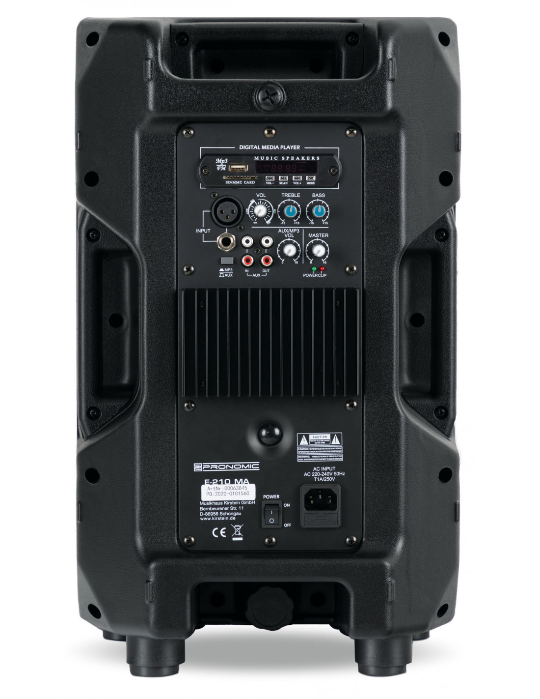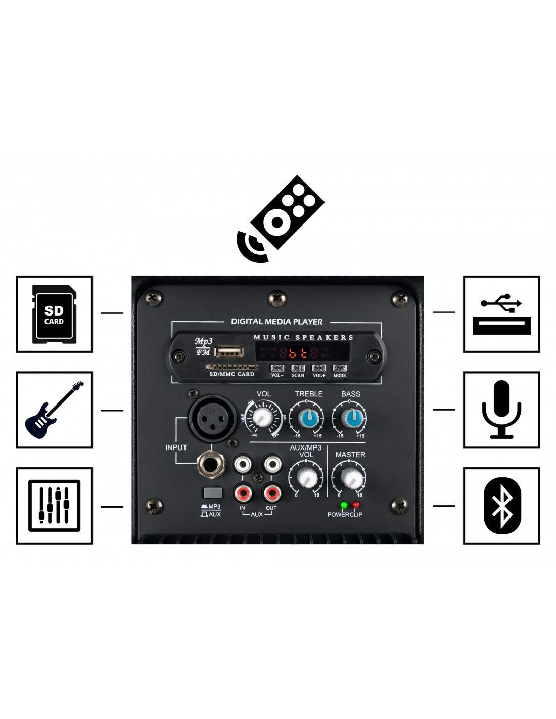 Woofer: 10" (254 mm), tweeter: 1.0" compression driver, SPL: 110 dB, power: 100 Watt (RMS) / 200 Watt (Peak), mic/line input (XLR or 6.35 mm jack), AUX IN and AUX OUT (RCA cinch jacks), volume control for Mic/Line input and AUX/MP3, media player for USB and SD memory media for the playback of MP3 files, Master volume control, 2-band equalizer, power and clip LED, frequency response: 70 Hz - 20 kHz, sensitivity (1m/1W): 92 dB, crossover frequency: 3.0 kHz, power input, Frequency band (Bluetooth): 2401.418 - 2480.498 MHz, durable, lightweight plastic housing, 3 carrying handles (2x on the side, 1x on top), Black protective grille made of metal, dimensions (WxHxD): 31 x 50 x 32.5 cm, weight: 10.3 kg,