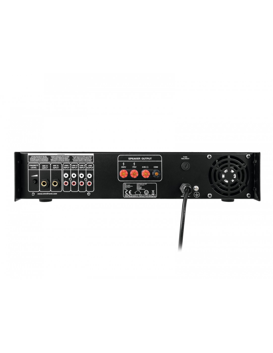 | Connections: | Input: Microphone via 2 x 6.3 mm plug (unbal.) Input: Microphone via 1 x 3-pin XLR/6.35mm jack (F) combination socket (mounting version) Input: line via 3 x stereo RCA 0,3 V Output: line via 1 x stereo RCA 0,3 V Output: speakers via screw terminal |
