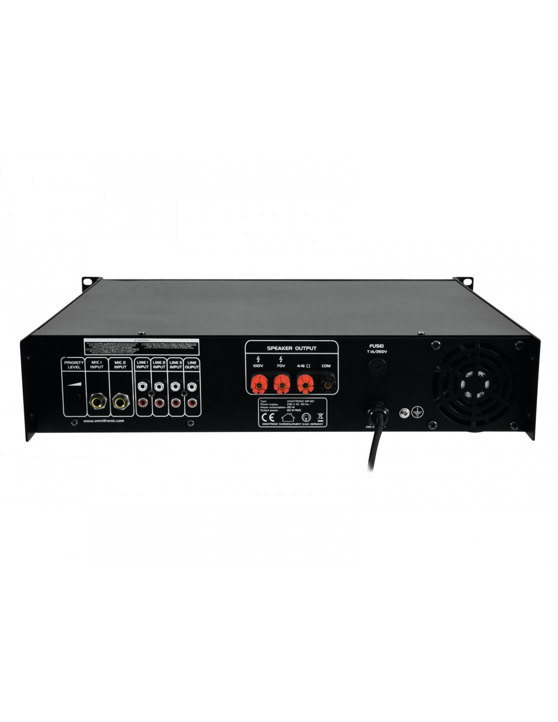 High reliability with a maximum of flexibility The Omnitronic MP-60 ELA mixing amplifier is your reliable partner when working with ELA sound systems. Thanks to its 19" format, it is ideally suited for both mobile and fixed installations. Outputs for ELA loudspeakers with 70 V and 100 V audio transformers or 4-16 ohms loudspeakers leave nothing to be desired. In addition, you can also connect a device with line level (e.g. mixing console) to the line output. With 6 mixable inputs you always stay flexible. Connect up to 3 microphones and 3 line level devices. Announcements are a priorityThe microphone input 3 on the front panel offers an adjustable priority circuit. It enables you to make important announcements with automatic, continuously adjustable level reduction of all signals. Use the gong to additionally point out your announcement. Protective features A fan protects the interior of your MP-60 from overheating. In addition to a switch-on delay, it has overvoltage and short-circuit protection circuits. In these cases, your speakers are electrically isolated from the amplifier. The FAULT LED lights up then and both the MP-60 and your speakers are protected against damage.
