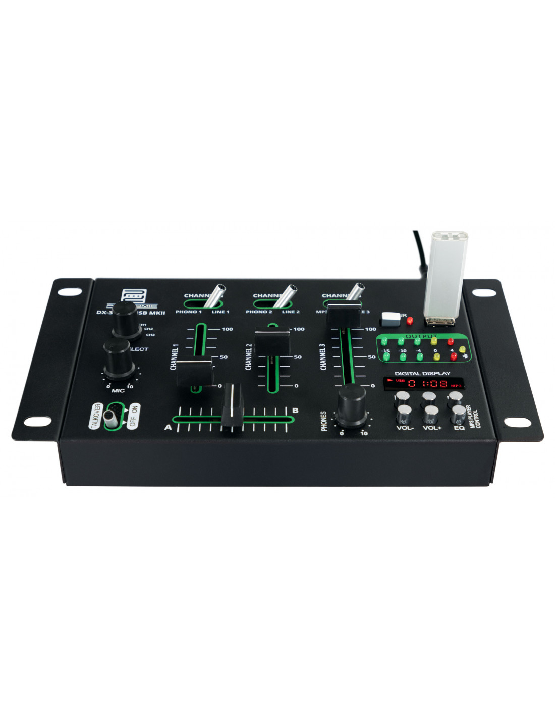 3-channel DJ mixer with integrated Bluetooth interface and MP3 player for USB sticks, Ultraglide fader with 45mm, cue function, robust construction, 2x line/phono channel, 2x 6.3mm microphone jack, 6.3mm headphone output, talkover function, LED level indicator, 6 equalizer presets for media players, powder-coated housing made of robust steel, Overall dimensions (WxDxH): 233 x 131 x 49 mm, weight: 720 g,