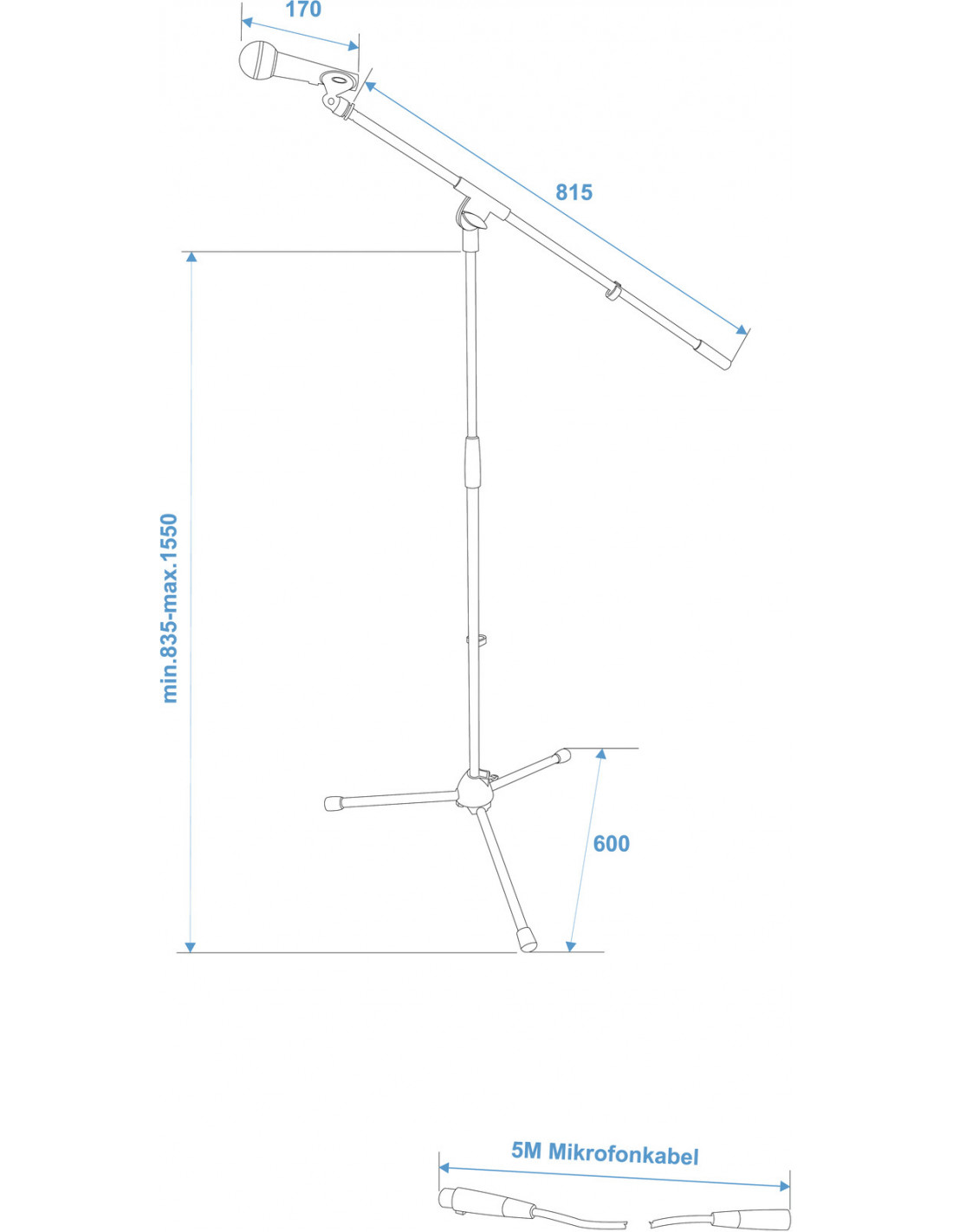 - Set consisting of one microphone, 5 meter microphone cable, one microphone stand, one microphhone clamp and a nylon bag