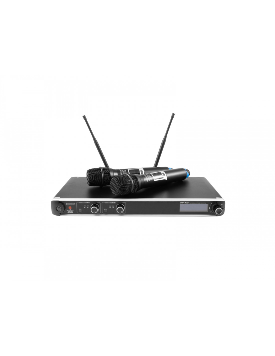 - 2-channel multifrequency receiver unit and 2 hand-held microphones with UHF PLL technology