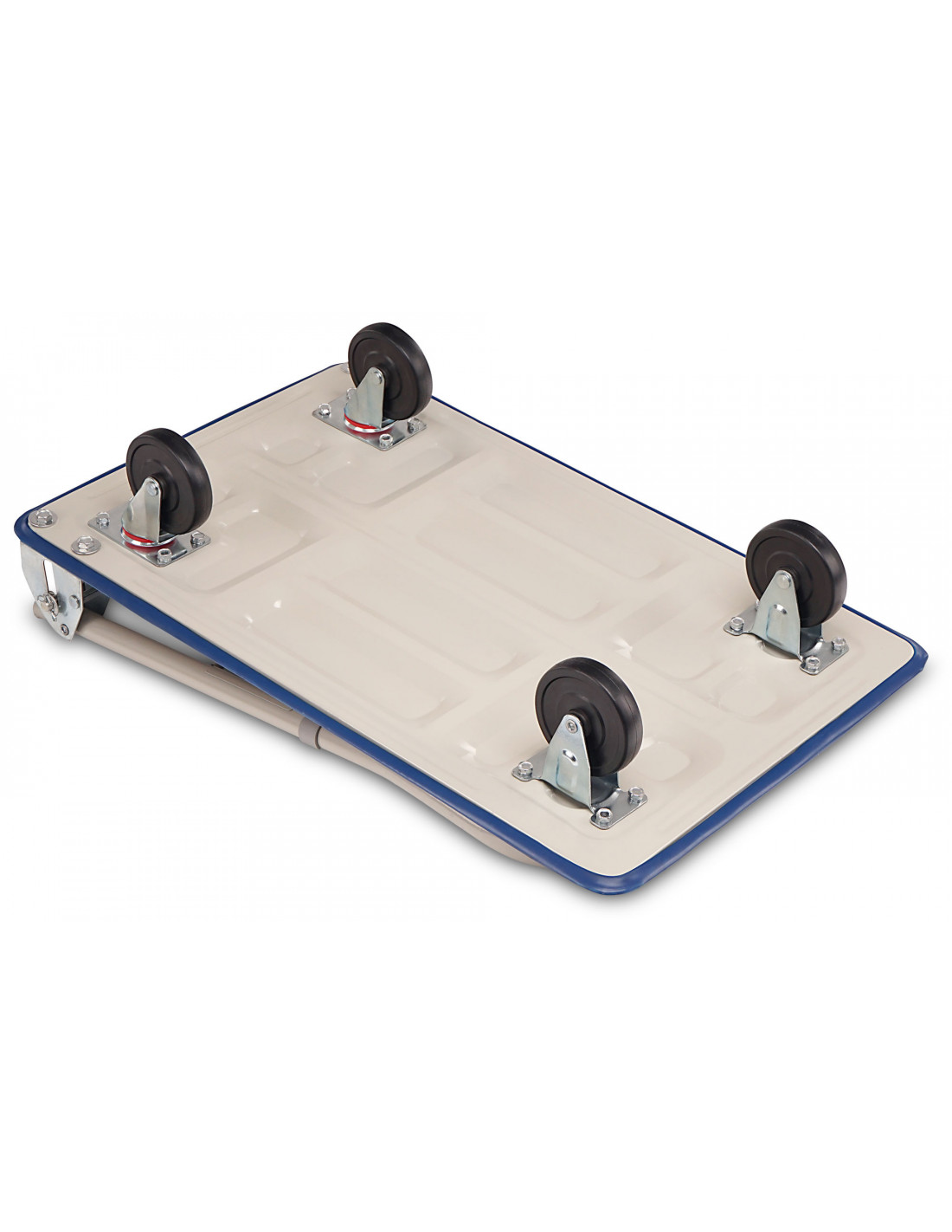 Practical transport trolley for storage, relocation or gardening, Rubber pad protects the load from slipping, rubberized edge protector, Fold-down 90° handle with foot control, 4 castors (2 block and 2 turnable wheels), loadable up to 150 kg, Wheel diameter: approx. 9.5 cm, back-friendly transport, Robust, powder-coated steel plate, Dimensions (L x W x H including handle): 73 x 47.5 x 84 cm, weight: 8.5 kg,