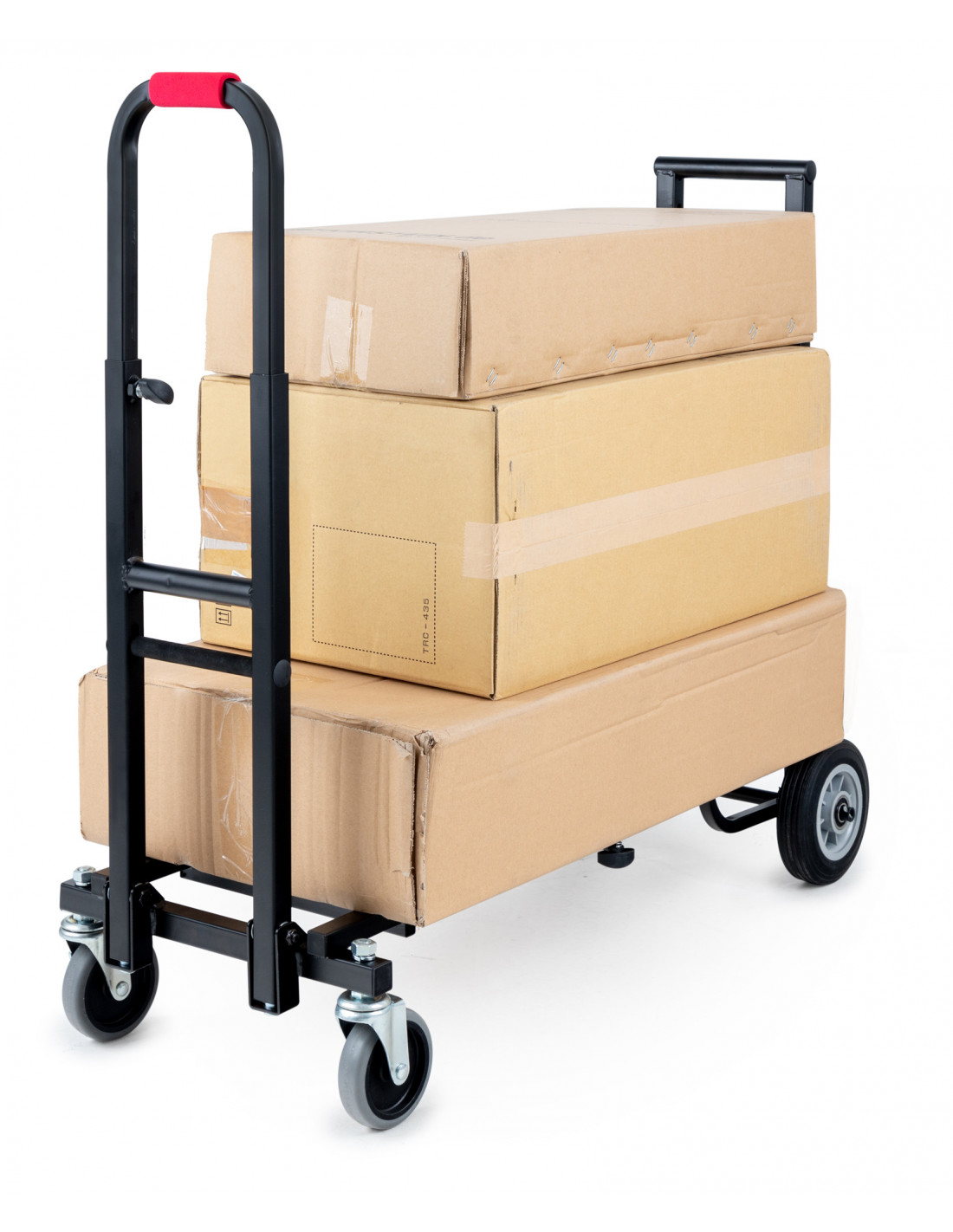 Length (usable loading area): up to 58 cm, width loading area: 27 cm, width including wheels: 38 cm, Folded dimensions (LxWxH): 75 x 38 x 20 cm, unfolded dimensions (LxWxH): 94 x 38 x 89 cm, Folded height: 20 cm, rubber wheels (width x diameter): 2.5 x 10 cm (one with foot brakes), Rear wheels (width x diameter): 4 cm x 15.5 cm (ball bearings), load capacity: max. 100 kg, Tube diameter of square tube: 2.5 cm x 2.5 cm, anti-slip tape on the loading area, weight: 9.1 kg ,