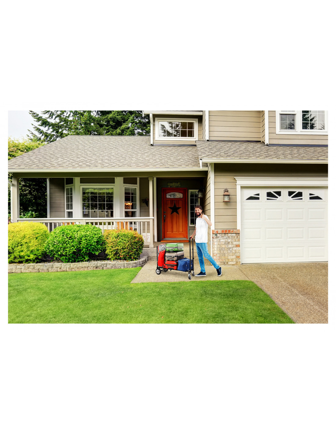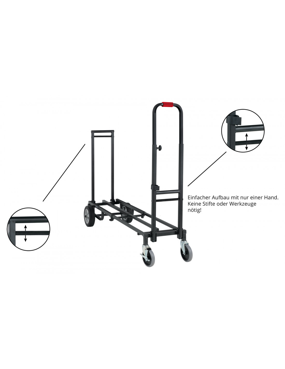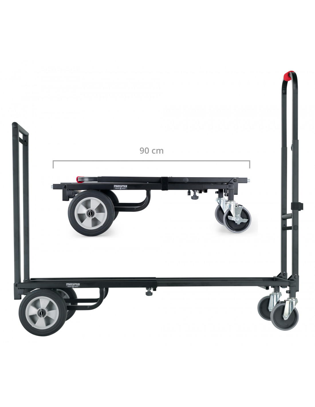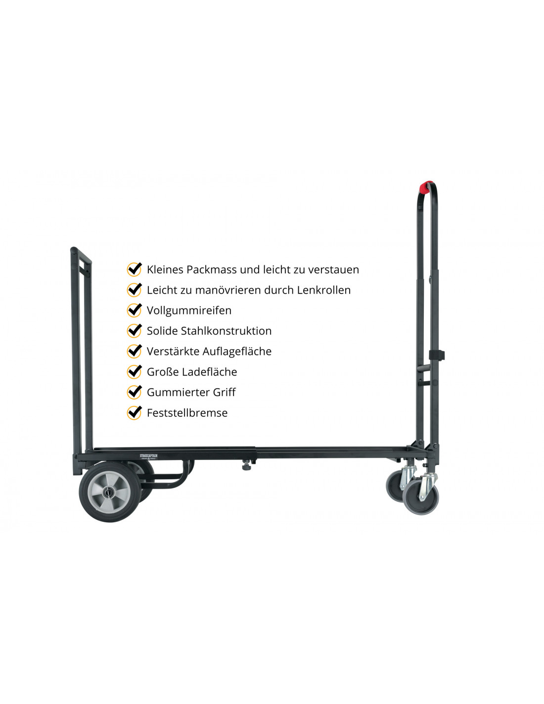 StagecaptainLength (usable loading area): 73-120 cm, height: 116 cm, width loading area: 32 cm, width including wheels: 47 cm, Folded dimensions (LxWxH): 84 x 47 x 25.5 cm, unfolded dimensions (LxWxH): 126.5 x 47 x 116 cm, Folded height: 25.5 cm, height folded: 116, front wheels (width x diameter): 2.5 x 10 cm (one with foot brakes), Rear wheels (width x diameter): 5 cm x 20 cm (ball bearings), load capacity: max. 150 kg, diameter for square tube: 25 x 25 mm, anti-scratch tape on loading surface, Fixed hook-and-loop strip prevents it from opening automatically when not in use, loading area can be continuously extended, weight: 13.8 kg ,