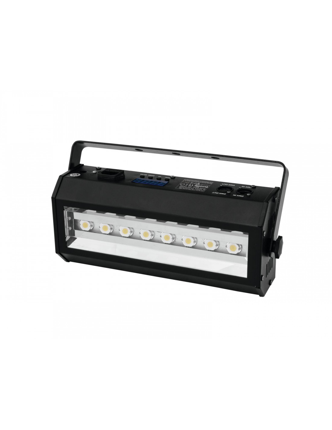 This LED strobe is equipped with 8 x 20-watt COB LEDs and combines strobe, chase and blinder effects. It lets you create both dynamic stage shows and the more low-key effects in between with a single fixture.You can choose from three different operation modes: master-slave, stand-alone and DMX mode (5 DMX channels). The integrated microphone makes for great light effects to the rhythm of the music.The fixture has 3-pin DMX connectors as well as an IEC input to connect it to the mains.