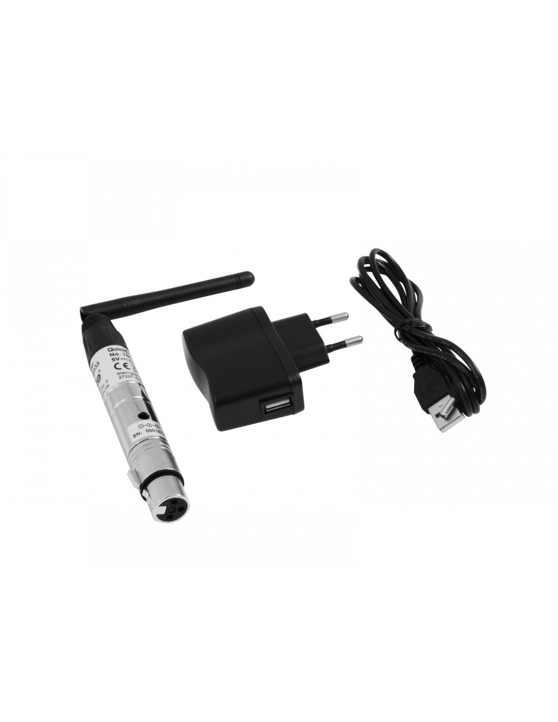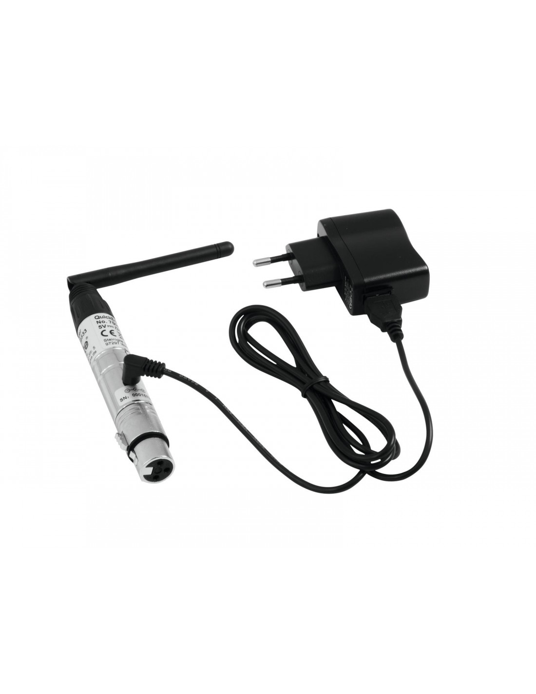 Compact DMX Wireless System 2.4 GHzThe Eurolite QuickDMX transmitter and receiver is used for wireless transmission of DMX512 signals. The complete technology is integrated in an extended 3-pole XLR connector (female) with a rotatable antenna. The device is constructed as a transceiver, so it can be used as any transmitter and receiver. The use of this device eliminates the necessity of time-consuming cabling between the DMX lighting control unit and the DMX-controlled devices.Due to the GFSK technology (Gaussian Frequency Shift Keying), interference-free operation is also possible besides other wireless Bluetooth and WiFi devices.The range is up to 400 meters with visual contact.Setup is very easy via Plug & Play with a button for connecting and disconnecting QuickDMX receivers.